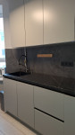 Кухня оборудована встроенной мебелью, газовой поверхностью, вытяжкой, микроволновкой, посудомоечной машиной