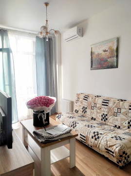Изюминка квартиры - большой балкон (терраса) с прекрасным видом. Кухня совмещена с зоной гостиной (диван и ТВ), спальня отдельная. Есть небольшая гардеробная.