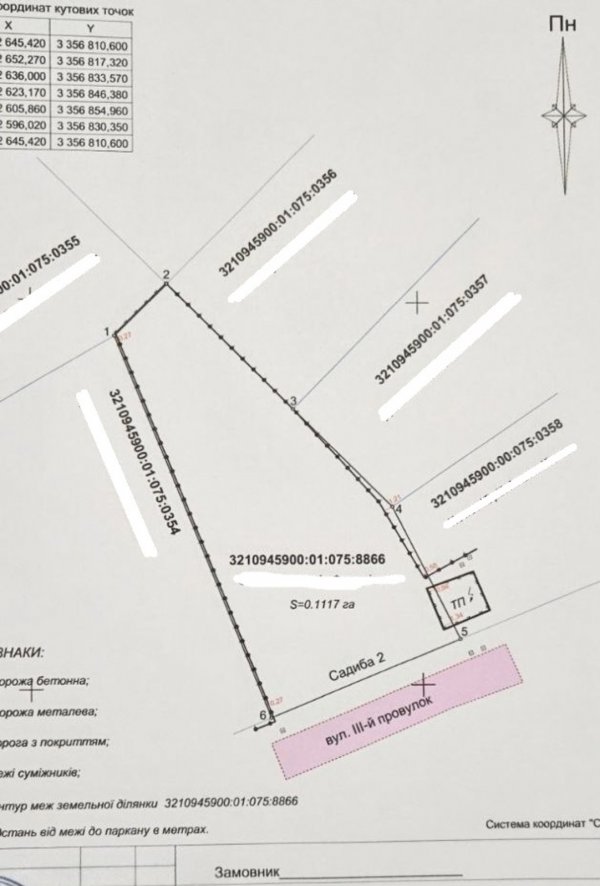 Площа ділянки 11 соток Призначення: індивідуальне житлове будівництво Форма ділянки неправильна пятикутна, релєф рівний. Комунікації: Підїздна дорога – асфальт. Поряд житлові будинки.