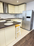 Кухня-вітальня з барною стійкою, вся техніка (посудомийна машина, духовка, варильна поверхня, витяжка, великий холодильник з льодогенератором, мікрохвильова піч).