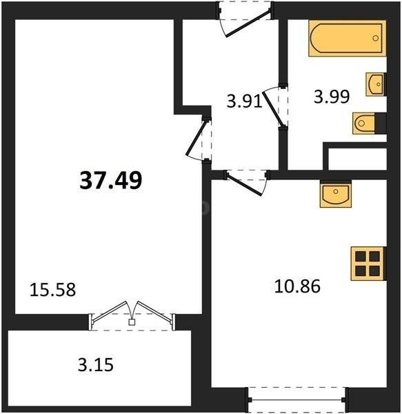 В продаже имеются квартиры в жилом комплексе "Семисчастье" премиум-класса. Общая площадь составляет 37,49 кв.м., при этом кухня - 10,86 кв.м. Высота потолков достигает 2,7 м.