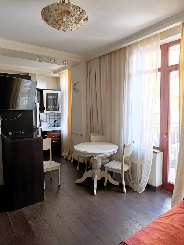Славна нова 1но кімнатна квартира в Каретному провулку, 7, ріг вул. Толстого. 10-15 хвилин пішки до Дерибасівської Вхід з вулиці через ворота на коді, потім ще одні двері – вхід в маленький дворик на кілька квартир. Квартира розташована на 1ом поверсі, загальна площа 35м2, висота стелі 2,7 м. При вході в квартиру потрапляємо в передпокій, з неї зліва кухня, прямо – санвузол. З кухні вихід в спальню. Кухня 15м2в ній кухонні меблі, обідній стіл і стільці, розкладний диван. Спальня 14м2 в ній велике ліжко, шафа, письмовий стіл, великий ТВ. Вікна спальні виходять у маленький дворик з квітами. Квартира обладнана: холодильник, кондиціонер, Інтернет wi fi, телефон, LCD ТВ 32 " з кабельним телебаченням, пральна машинка. Санвузол суміщений, в ньому кутова ванна, умивальник, туалет. Максимальне розміщення 4 людини. Парковка не охороняється на вулиці або під охороною на вулиці Ковальській.