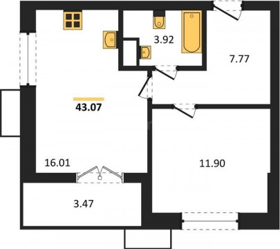 В продаже имеются квартиры в жилом комплексе "Семисчастье" премиум-класса. Общая площадь составляет 43,074 кв.м., при этом кухня - 16,01 кв.м. Высота потолков достигает 2,7 м.