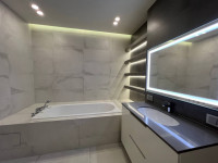 Шкафы и мебель как бы сливаются с потолком и стенами, создавая чувство свободного пространства. При выборе мебели определены полки с дверцами и закрытые стеллажи, а также приобретён низкий диван. Кухня также выполнена в стиле минимализма, отсутствует перенасыщение лишними предметами. Вся бытовая техника встроенная. Мебельные фасады Rehau Brilliant (Германия) создали стереоэффект поверхности, что визуально привлекает внимание, расширяет интерьер кухни и создает эффект непрерывного блеска. Фурнитура Blum (Германия). Столешница кварц Lapitec 20 мм (Италия). Шкафы имеют автоматическую подсветку.