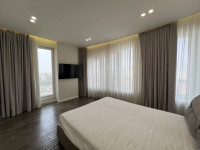 Спальня с видом на море имеет свою гардеробную со встроенными шкафами. Интерьерспальни создан просторный за счет небольшого количества мебели. Вещи удобно будет хранить во встроенных шкафах и тумбочках простой формы. Шторы создают уют и соответствуют стилю благодаря брендовым тканям Astra home и Ridex Jazz Fusion (Германия, блекаут). Кровать имеет лаконичную форму с тканевым изголовьем.